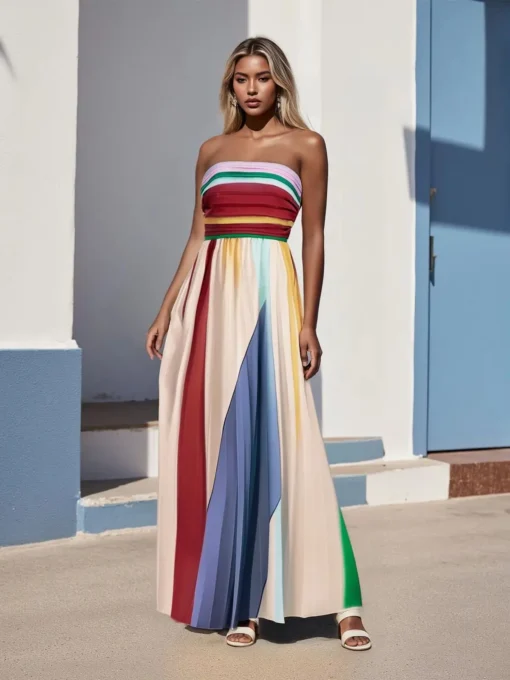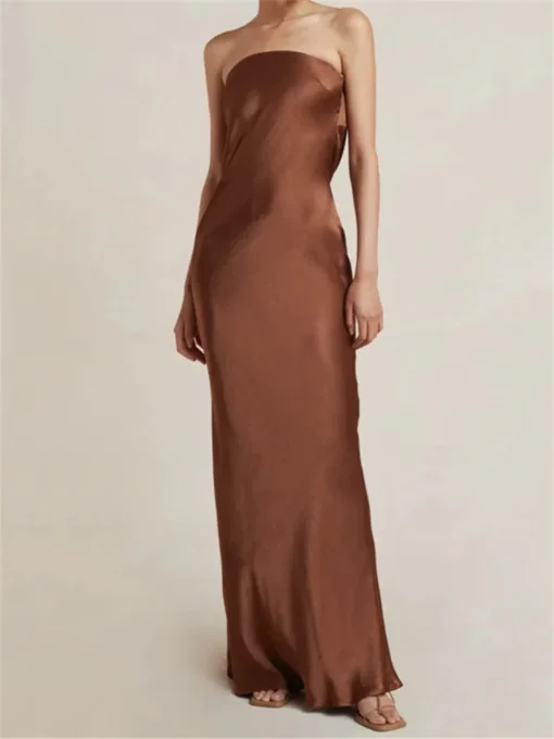 Women Party Long Dress Solid Color Tube Dress Summer Fashion Backless Casual Strapless Pleated Dress with Choker Scarf