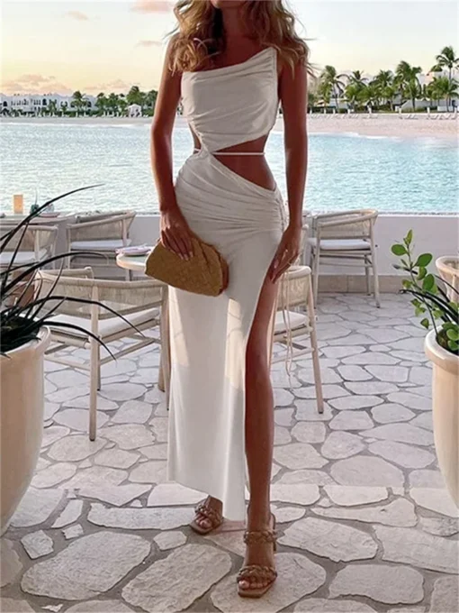 Women Long Dress Solid Color Knotted Hollow-Out High Slit Dress Summer V-Neck Sleeveless Dress for Party Evening