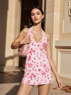 Floral Halter Mini Dress for Women Summer Fashionable Beaded Sleeveless Backless Bodycon Short Dress