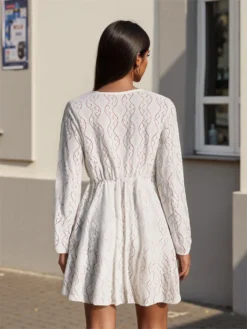 Women Eyelet White Dress Long Sleeve Deep V Neck Lace Patchwork Dress Autumn Casual Bohemian